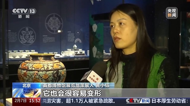 首都博物馆展览部策展人黄小钰:这件珐华器工艺非常复杂,器型也很大,同时还有双层镂空。从器型、颜色、镂空工艺来看,这件文物保存得很好、十分精美。